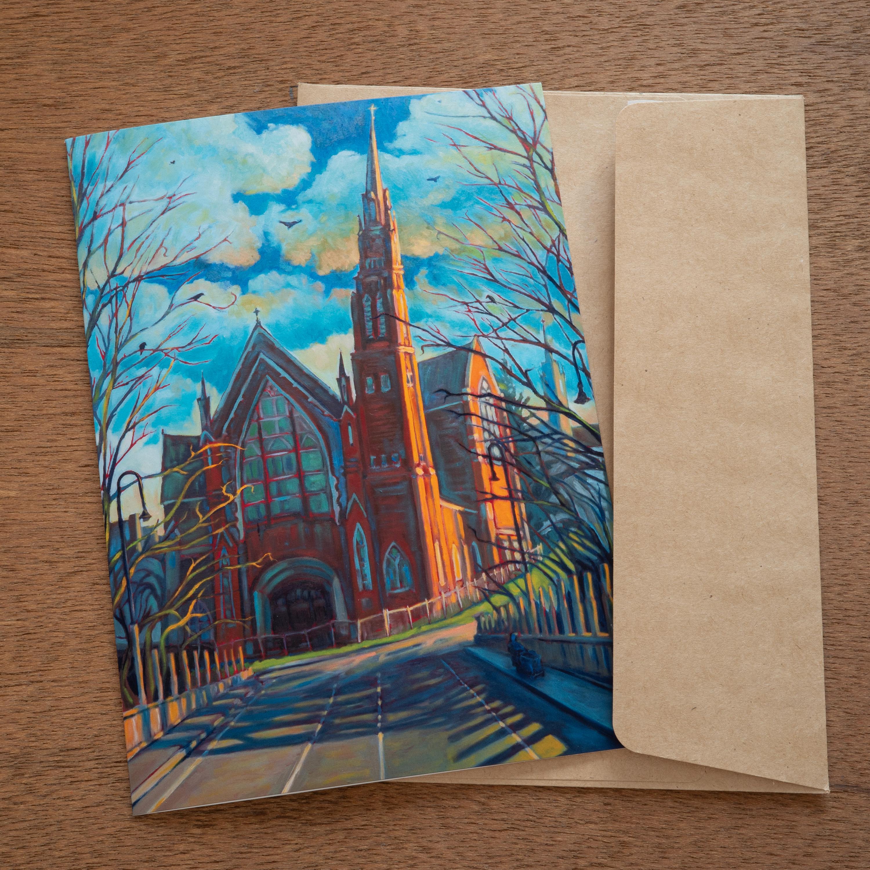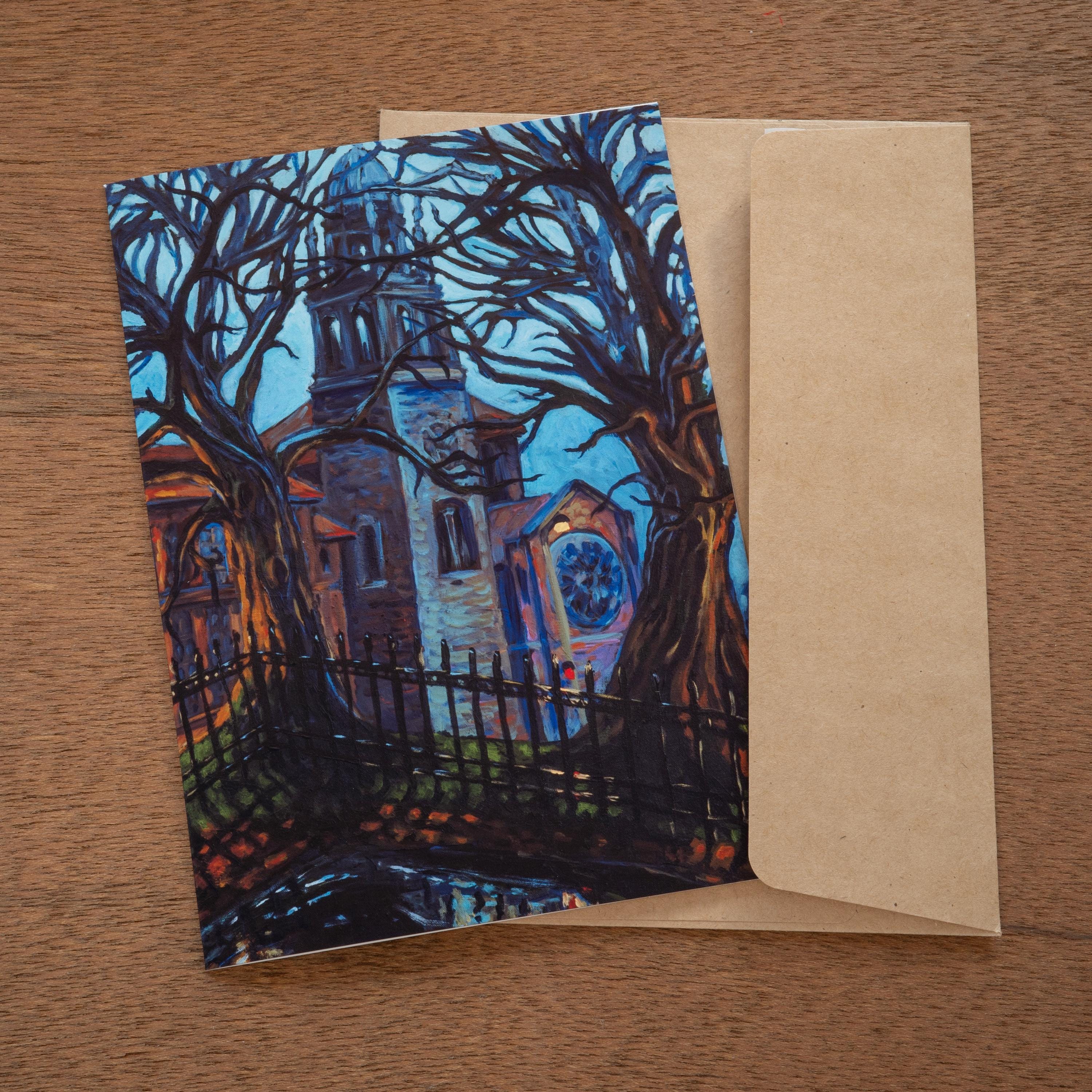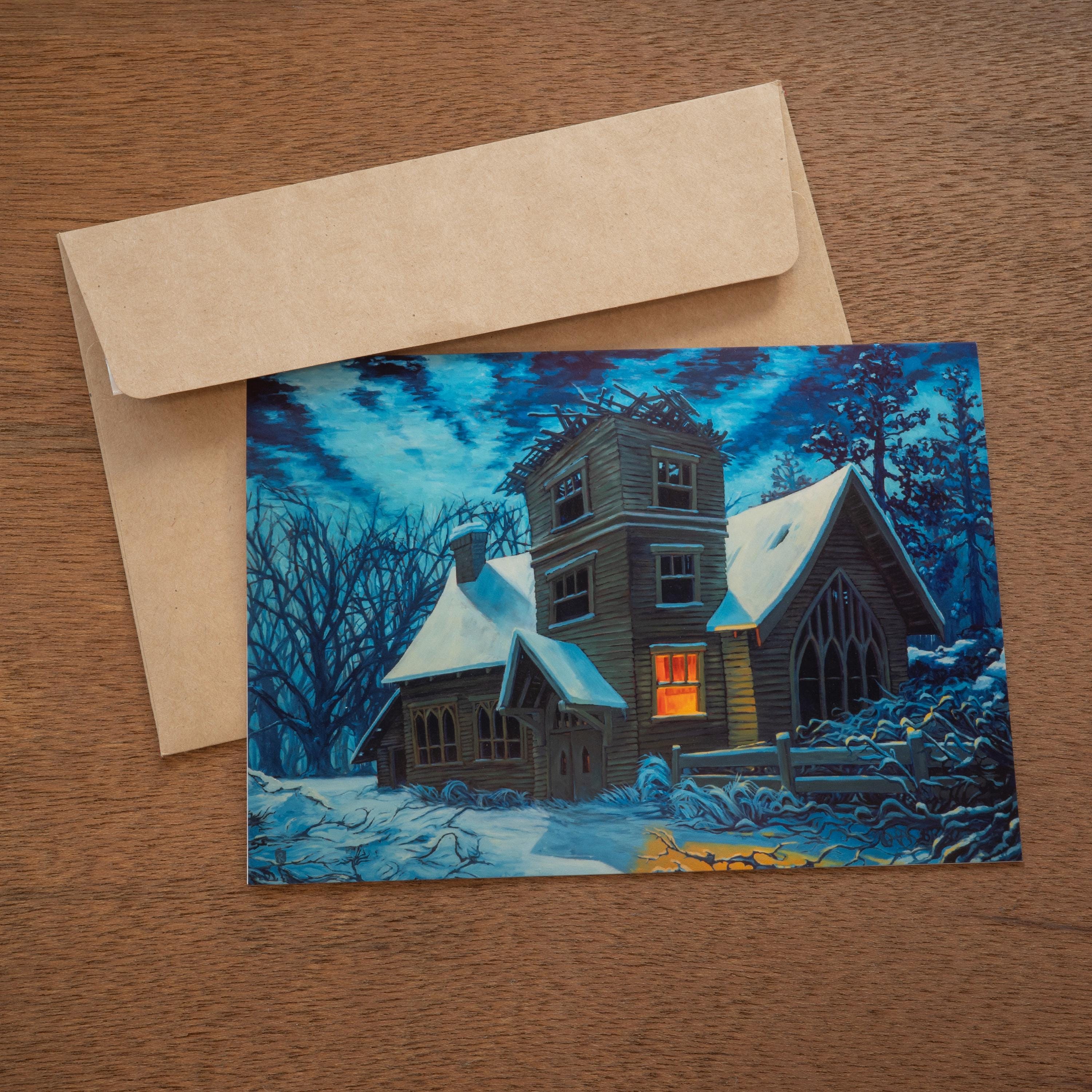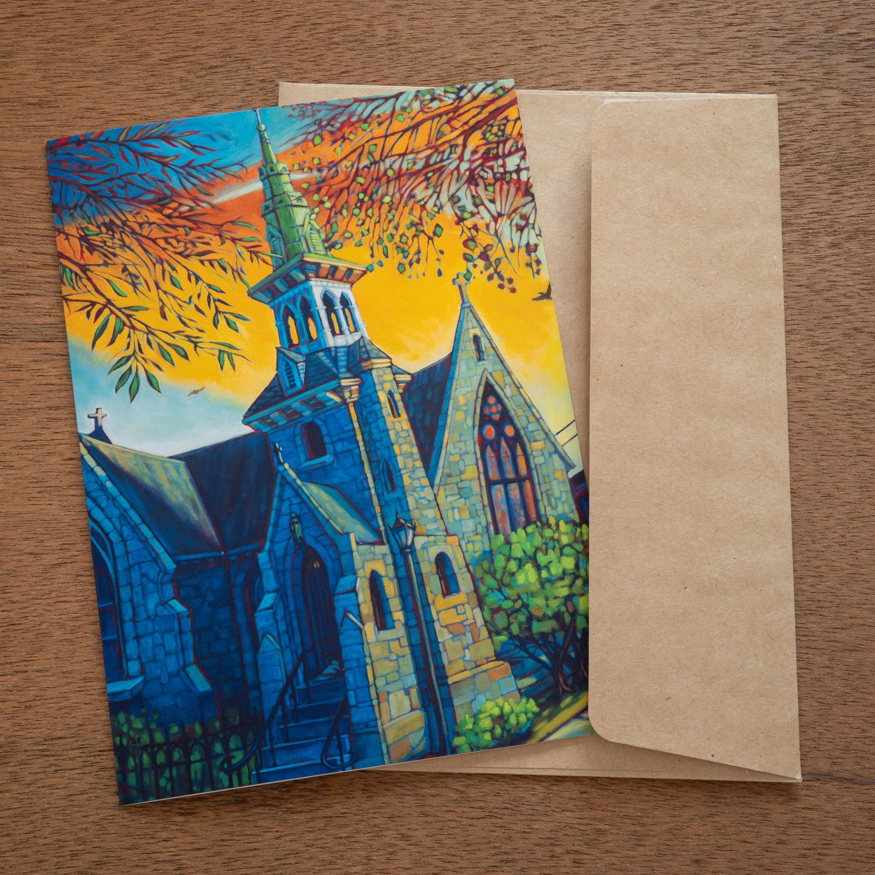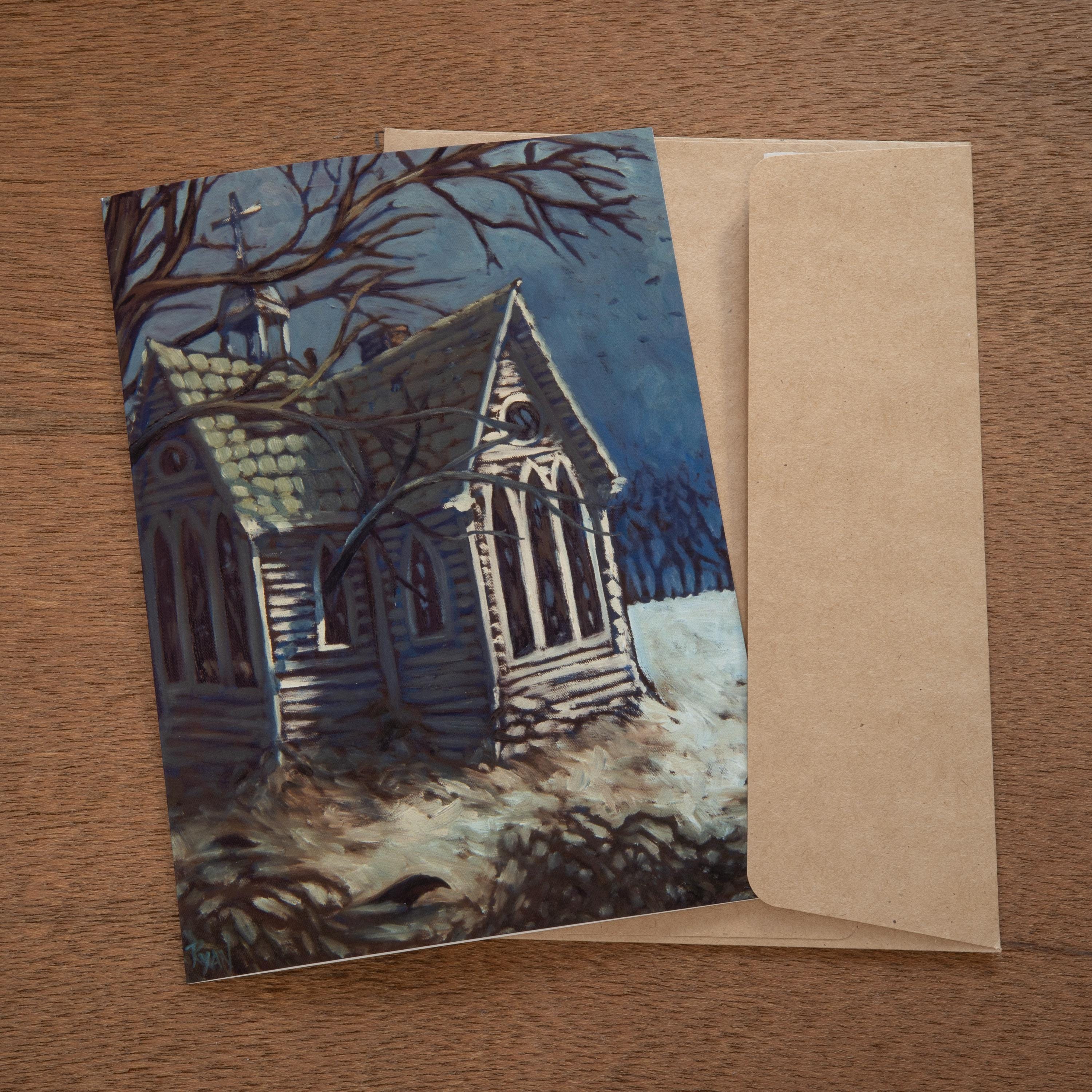 Set of five unique 5" x 7" greeting cards. Each card is a print of one of my original oil paintings. Each painting is based on a real church: